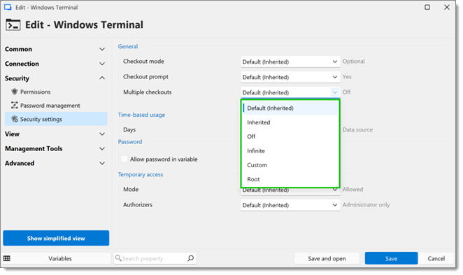 The Multiple checkouts setting in Remote Desktop Manager Windows allows multiple users to checkout and edit the same entries simultaneously. To do so, go into the Properties of an entry, folder, root folder or Vault settings and navigate to Multiple checkouts.