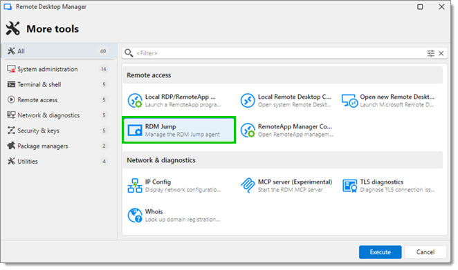 Installer Remote Desktop Manager et sélectionner Outils – Plus d'outils – RDM jump. Cela lancera et auto-enregistrera l'agent pour démarrer automatiquement avec Windows.