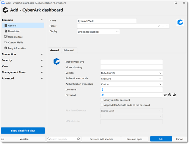 Dans Remote Desktop Manager, créer votre entrée CyberArk Dashboard. Assurer que cela soit fait à partir de la version 2023.2.18 ou ultérieure et non à partir de la version précédente.
