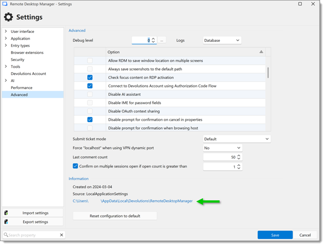 Cliquer sur le lien en bas qui mène à vos fichiers de configuration Remote Desktop Manager.