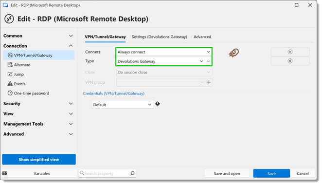 In the Settings (Devolutions Gateway) tab select the gateway configured in Devolutions Server Configuration.